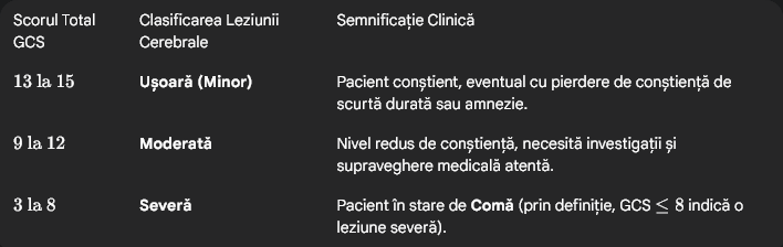 Scorul GCS este utilizat pentru a clasifica severitatea leziunii cerebrale, în special a Traumatismului Cranio-Cerebral (TCC):