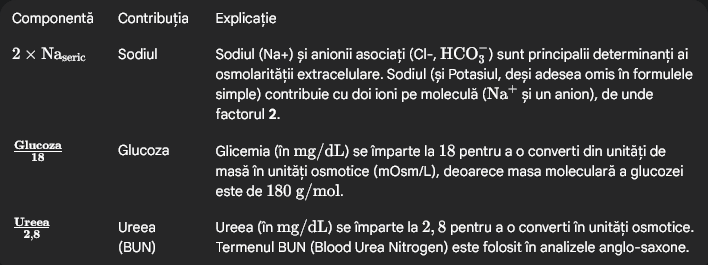 Notă: Potasiul (K+) este uneori inclus în formula mai precisă: 2×(Na++K+)+…, dar adesea este omis deoarece contribuția sa la osmolaritatea plasmatică este relativ mică.