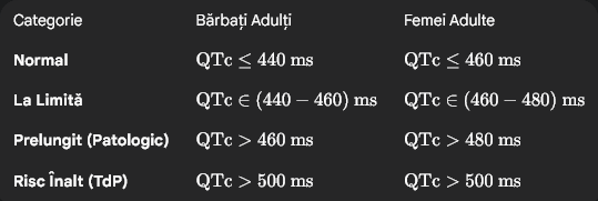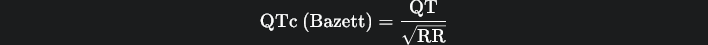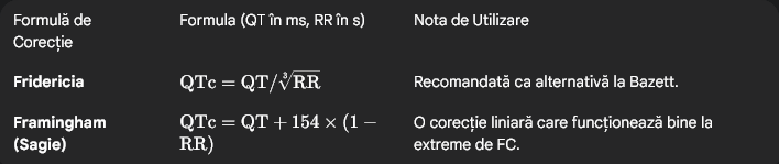 - Elementele Formulei QTc = Intervalul QT Corectat (în secunde sau milisecunde) QT = Intervalul QT măsurat pe EKG (în secunde sau milisecunde) RR = Intervalul R-R (timpul între două complexe QRS succesive, în secunde)