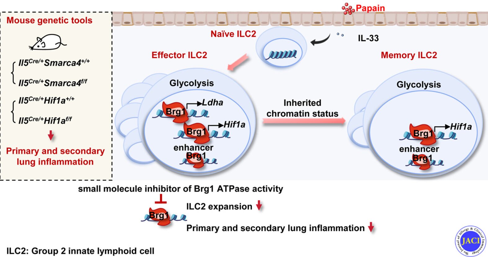 Cercetătorii au descoperit, de asemenea, că această „amprentă metabolică” modelată de Brg1 poate fi reținută de la ILC2 efectori la ILC2 de memorie, permițând celulelor de memorie să mențină nivele ridicate de activitate glicolitică și capacitate rapidă de răspuns în momentul re-expunerii la alergeni. În modelele animale, eliminarea specifică a Smarca4 sau Hif1a în ILC2 a inhibat semnificativ proliferarea ILC2 și a ameliorat atât inflamația pulmonară acută, cât și cea secundară, demonstrând că Hif1α este o moleculă cheie care leagă Brg1 de