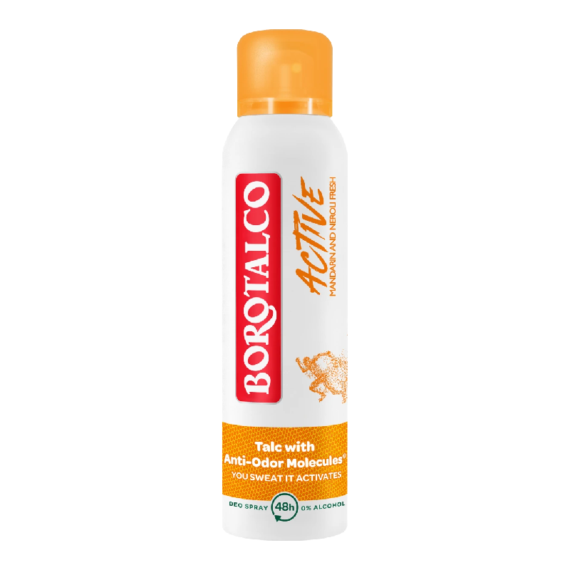 BOROTALCO Deodorant spray Active Mandarine&Neroli, cu tehnologia inovativa Odor-Converter asigura protectie eficace si de lunga durata: microcapsulele din componenta acestuia se activeaza odata cu miscarea, asigurand extra protectie impotriva transpiratiei si o senzatie de prospetime de lunga durata.Parfum delicat, caracterizat prin note fresh de manadarine si flori de portocal.