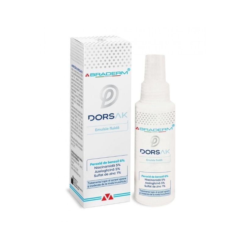 Dorsak spray emulsie fluida este un tratament antibacterian si antiinflamator specific pentru tratamentul acneei si foliculitei de la nivelul pieptului si/sau a trunchiului.