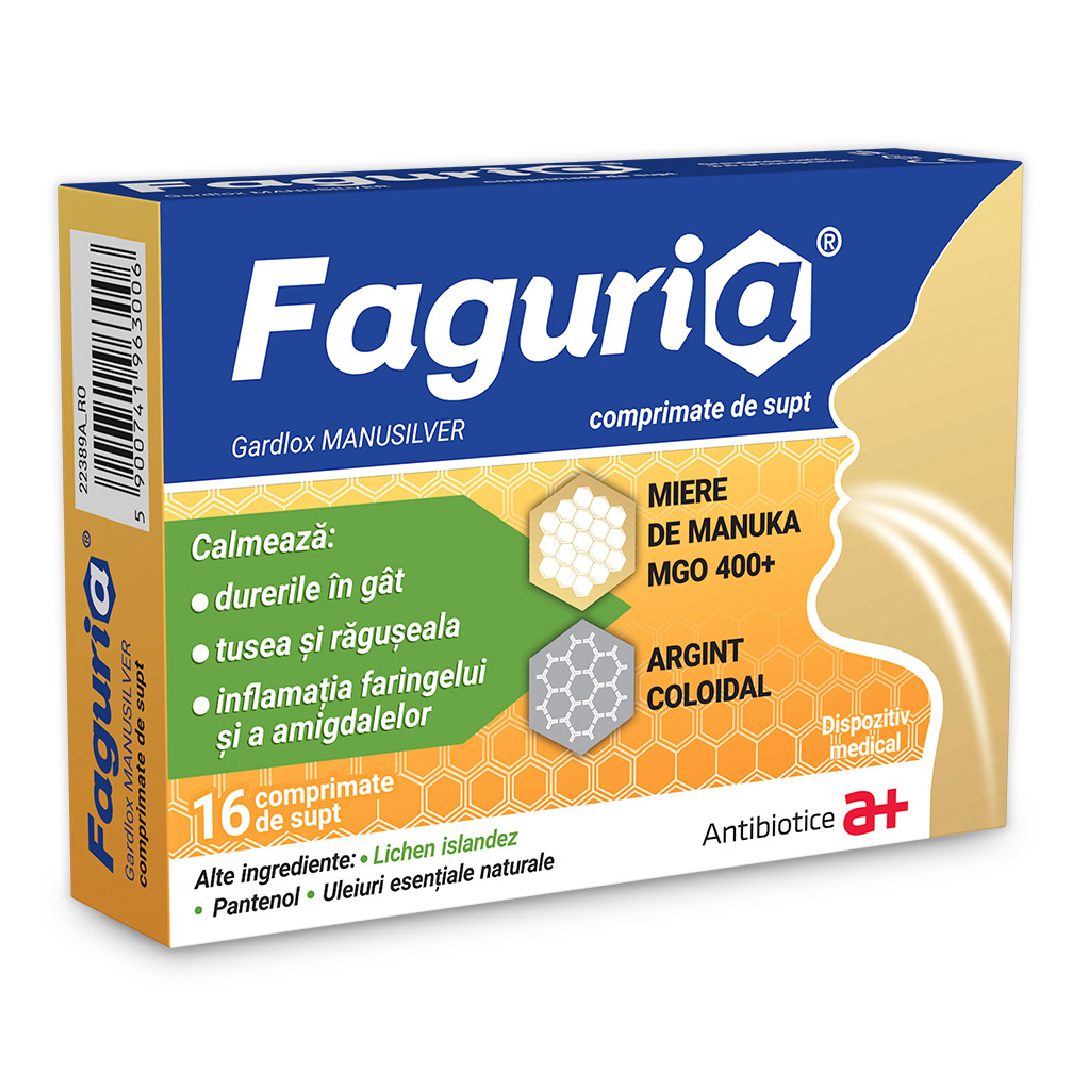 Cumpara „Faguria, 16 comprimate de supt, Antibiotica SA” – Vitamine si suplimente > Vitamine si suplimente > Raceala si gripa > Vitamine si suplimente > Raceala si gripa > Durere in gat.
