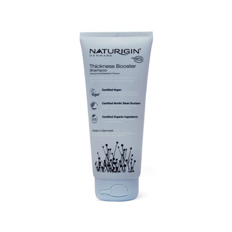 Esenta Naturigin este de a privi intregul ciclu de viata al produsului tinand cont de protectia sanatatii tale, a bunastarii animalelor si a mediului inconjurator. Certificarile Nordic Certification si Vegan Society garanteaza ca produsele Naturigin sunt ecosustenabile si sigure pentru consumator.Naturigin Sampon pentru volum, ingrosarea si fortifierea parului subtire ofera corpolenta parului subtire si fin, prevenind aspectul lipsit de vitalitate si fara volum. Adauga fortifiere consistenta si densitate parului fara a-l ingreuna, creand un aspect frumos si voluminos. Ingrediente organice certificate Aloe Vera, Afine, Iarba de Bumbac Nordic si Sare de Mare.