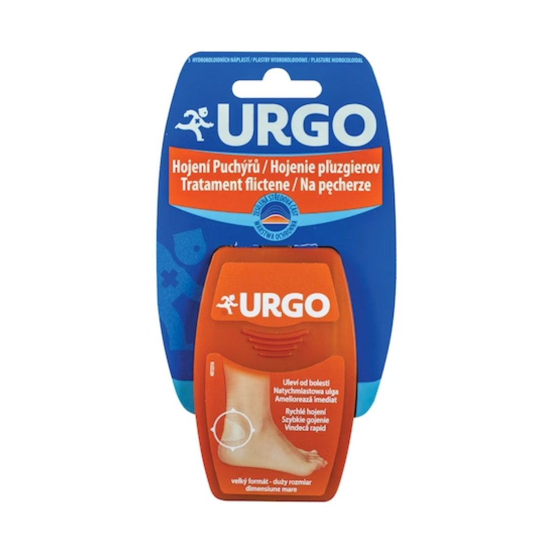 Plasturi mari pentru flictene (basici), 5 bucati, Urgo – actioneaza ca un al doilea strat de piele pentru a usura si ajuta la vindecarea flictenelor care apar la nivelul calcaielor.