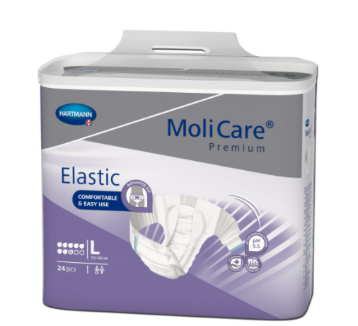 Noul slip pentru incontinenta MoliCare Premium Elastic se potriveste si se adapteaza la toate formele si miscarile corpului. Combinatia dintre partile laterale elastice, patentate si sistemul resigilabil Elastic-Fix, permite o manevrare usoara si fixare sigura. Recomandate atat persoanelor active, cat si persoanelor imobilizate la pat, asigurand o protectie sigura si confort sporit la purtare, in acelasi timp protejand sanatatea pielii, in cazuri de incontinenta moderata pana la severa.