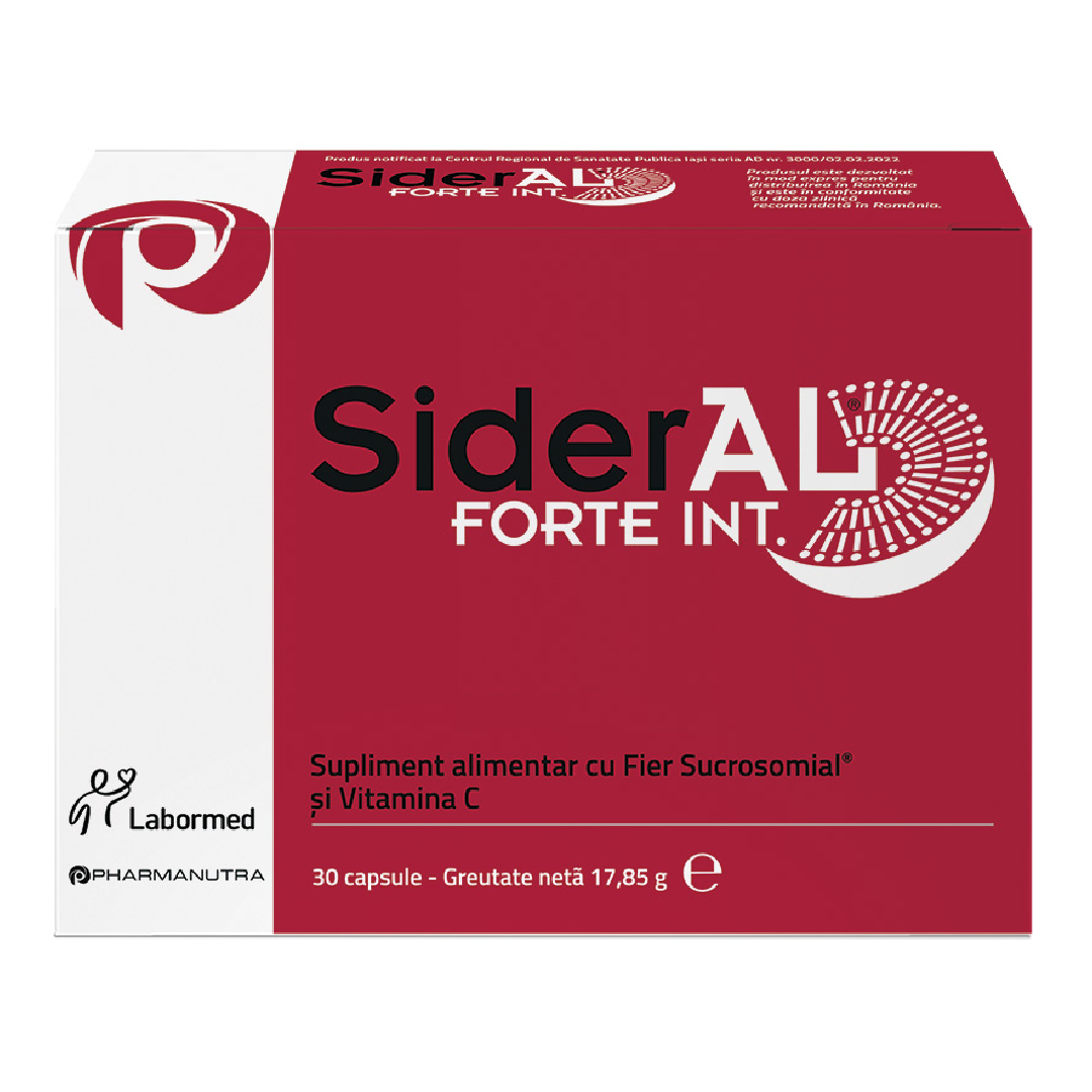 Sideral Forte, 30 capsule, Solacium Pharma, remediu pentru deficitul de fierFierul este indispensabil organismului uman, pentru producerea hemoglobinei si a mioglobinei, doua proteine care alimenteaza corpul cu oxigen. Cand valorile fierului sunt sub cele normale, vorbim de carenta de fier, situatie care afecteaza functionarea organelor. Sideral Forte, 30 capsule, Solacium Pharma este un supliment ideal pentru tratarea deficitului de fier. Datorita aportului de vitamina C si fier sucrosomial, Sideral Forte contribuie la cresterea imunitatii intregului organism.Avantajele administrarii suplimentului SideralSideral Forte, 30 capsule, Solacium Pharma este indicat in caz de carenta de fier fiindca nu provoaca arsuri gastrice, iritatii intestinale sau colorarea scaunului, tulburari gastrointestinale des intalnite la suplimentele de fier. Conform Sideral Forte prospect, suplimentul se administreaza o data pe zi, iar doza ideala este o capsula sau conform indicatiilor medicului. Sideral Forte, 30 capsule, Solacium Pharma se elibereaza fara prescriptie medicala si poate fi comandat online, cu livrare rapida.