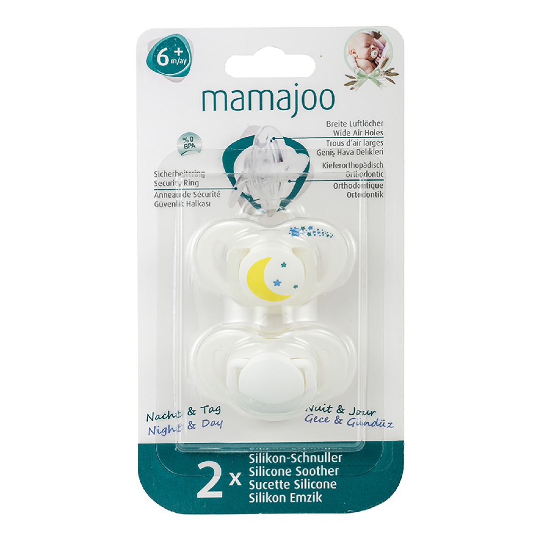 Forma ortodontica a suzetei Mamajoo este conceputa pentru a nu dauna dezvoltarii naturale a gingiilor si a dintilor bebelusilor, in timp ce orificiile largi de aer de pe ambele parti ale scutului pentru suzeta sunt concepute pentru a preveni acumularea de saliva si iritarea pielii sensibile ale bebelusului, oferind flux de aer mai mare.