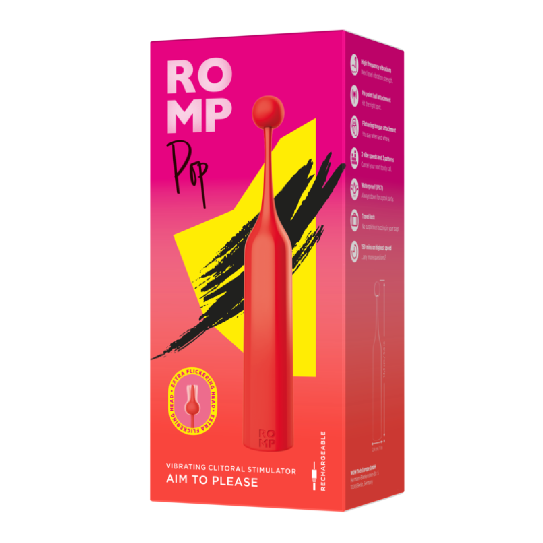 ROMP Pop este un stimulator de clitoris de inalta frecventa pentru joc versatil. Dispunand de doua capete interschimbabile, alegeti dintre senzatii precise si directionate sau senzatii de flirt si palpaire. Oferind 3 intensitati si 3 modele de vibratie, Pop ofera orgasme clitoridiene puternice la atingerea unui buton. Reincarcabila si rezistenta la apa, aceasta jucarie este intotdeauna gata sa multumeasca.