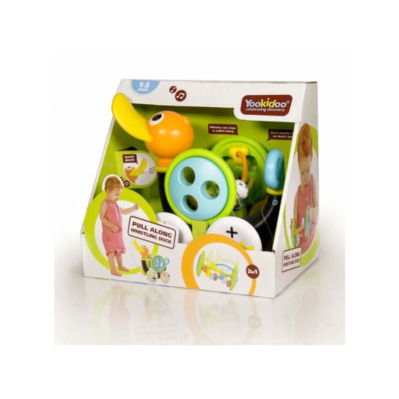 Rata suieratoare de la Yookidoo va deveni repede animalutul de companie indragit pe care copilul tau il va plimba in lesa. Rata va fluiera si va canta atunci cand este trasa de copil, dar poate fi folosita si in modul silentios.Continut pachet:1 Rata suieratoare Yookidoo (1-3 ani);1 cilindru detasabil cu margele.