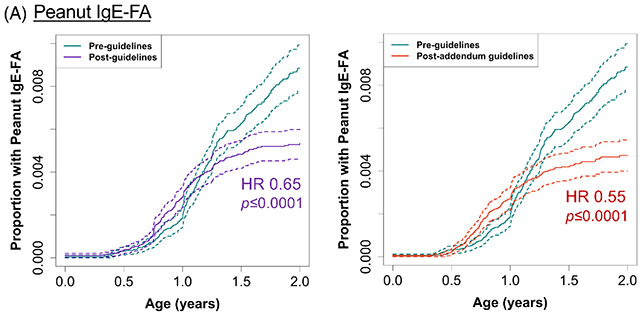 Cercetătorii au analizat date de sănătate despre aproape 125.000 de copii născuți înainte și după introducerea celor mai recente ghiduri. Alergiile mediate de IgE la arahide au scăzut de la 0,79% la 0,45% din grupul de studiu, în timp ce orice alergie alimentară mediată de IgE a scăzut de la 1,46% la 0,93%.